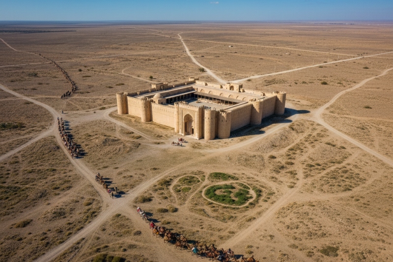 シルクロードなどの交易路で、商人たちが荷物を積んだラクダや馬と一緒に泊まり、休息や補給をするために建てられた公共施設です。
