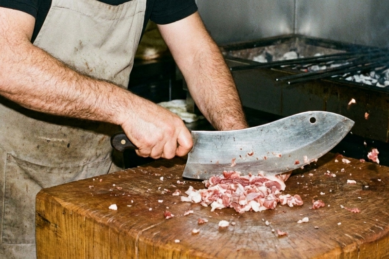 機械のミンチ機を使わず「Zırh」と呼ばれる三日月型の大きな包丁を使って、まな板の上で肉を細かくしていく手法が伝統的です。